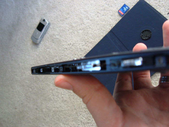 Hey all, just thought I would share these with you. Taking this thing apart was pretty easy. The right side (plastic) silver bumper pops out after unscrewing the one screw on the back, then sliding a slim knife or screwdriver under it (careful, they are fragile!). The Left side bumper has 2 screws holding it in place under the SD card flap. Once those are undone you can pop it out in a similar fashion. There are 4 screw holes on each side of the reader now. Unscrew those as well as the two near the port at the bottom and lift off the back cover (it is hinged at the top). The internals are screwed to the front faceplate. I did not have the time to dissect it any further. Everything went back together the same way with no problems. I did not notice any unused ports or anything fun like that on the motherboard. -lint