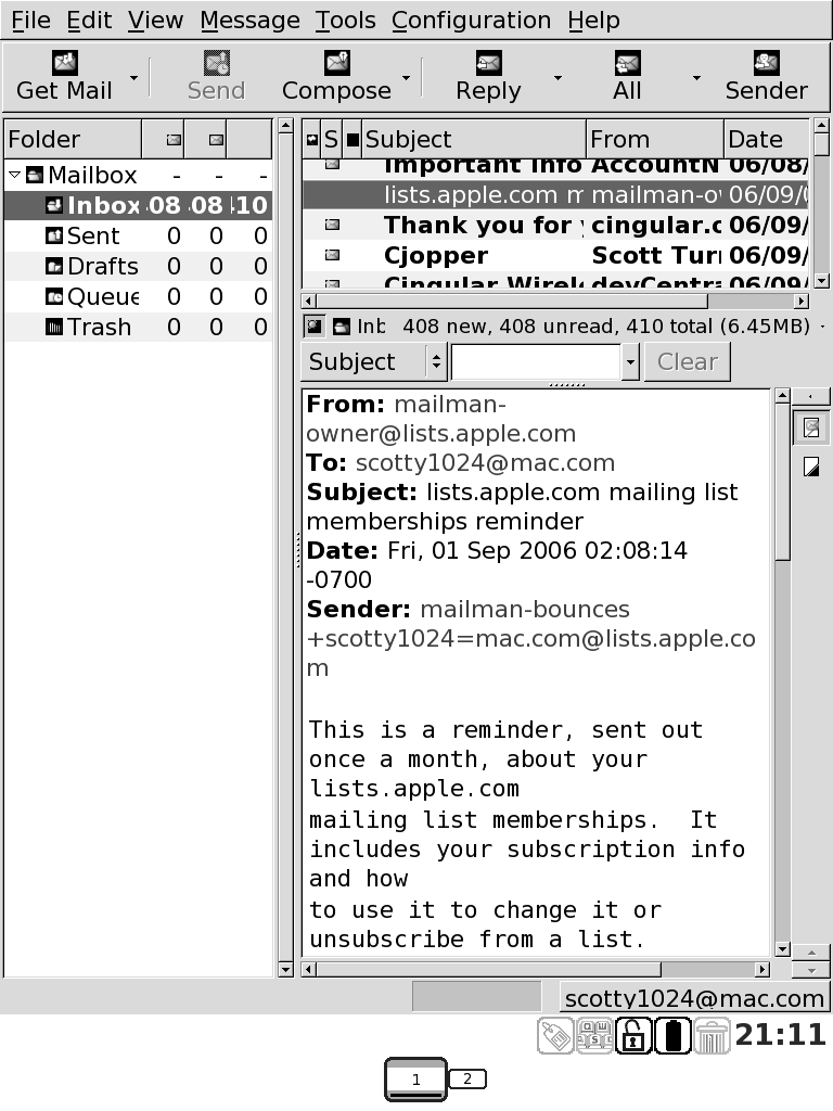 It is a port of Sylpheed Claws. http://claws.sylpheed.org/ An unlikely sounding name but it is feature packed, yet with a small footprint, expandable via plugins and a good "fit" for the iLiad's Gnomish roots. The plugin part means other developers can expand it to do more iLiadian things and do so from a more comfortable framework than having to do all the messy parts (installers, matchbox, erdm, etc...) And I'm a sucker for an email application that makes this promise when you first start it up.