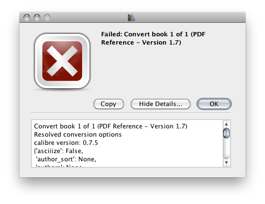 I am using version 0.7.5 on MacOS X 10.6 and I am getting the following error when trying to convert from a PDF to an ePub.