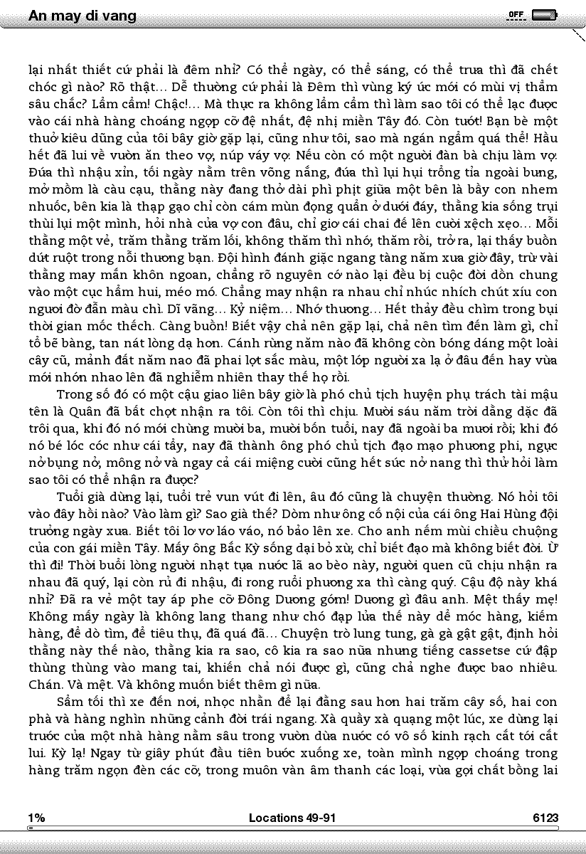 I could not read your An May Di Vang.prc file on my Kindle1 and even with my Mobipocket Reader for Windows. So what I did: -Opened your file with Calibre (free on http://calibre-ebook.com/download) -Used Calibre to convert it to a TXT file - Used MSWord to open this new TXT file - Save it as a Plain text file (*.txt) again (Choose Other Encoding :Unicode (UFT-8) - Use Notepad to open this .txt file. - Click on Format=>Font to change to the font: Times New Roman, click OK Now I can read the Vietnamese characters perfectly on Notepad. -Saved this one over the old one. -Use Mobipocket Creator for Windows to convert this new text file to prc file -Transfer this prc file to my Kindle to read. I can read it on my Windows Mobipocket Reader and my Kindle 1. I think it can also readable on Kindle DX I attached the new An May Di Vang FYI. Good luck Tommy Last edited by Tluong; 10-03-2010 at 03:12 PM. |
