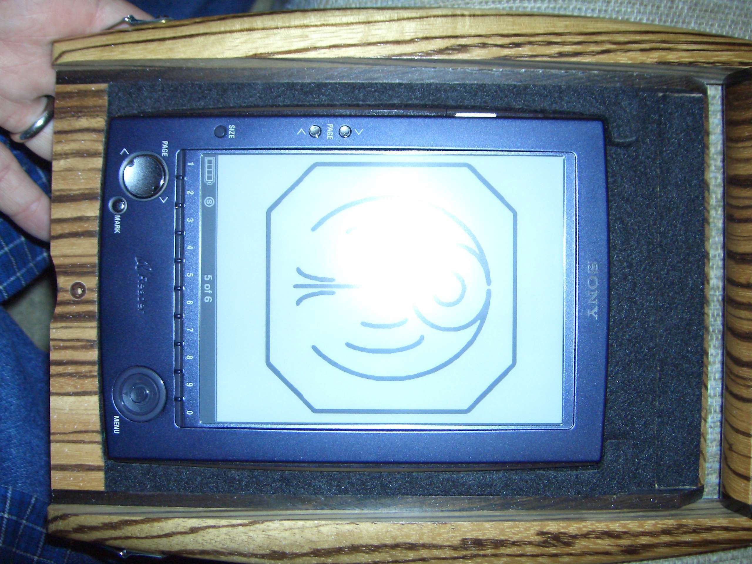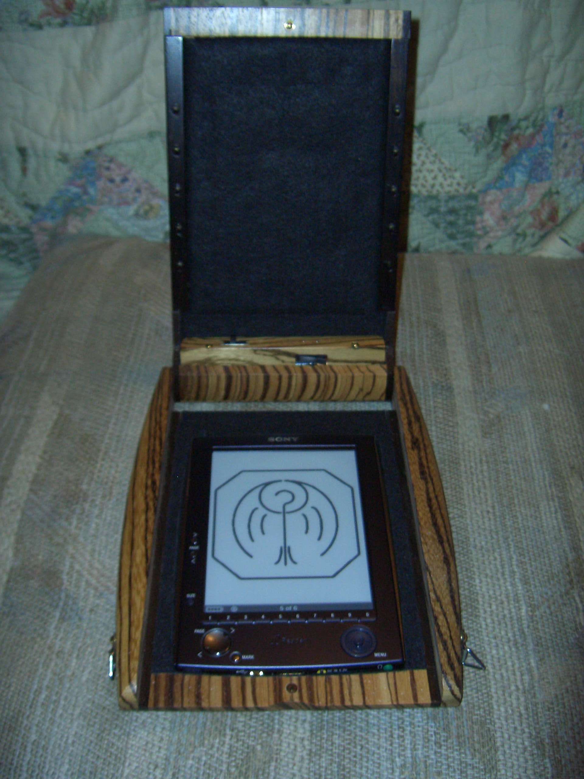By now many of you have noticed yvanleterrible’s new Avatar, and may be interested in knowing a bit more about it.Back around the end of October, Yvan asked me if I’d be willing to review a box if he went ahead and built one. I said I’d be willing if he wanted to do so. On Monday, December 4th the prototype arrived. Before I go too far, I need to point out clearly that this is a prototype, and has a (surprisingly) few prototype-related issues. These are primarily a result of the fact that it was built entirely from measurements that were transmitted over e-mail. Yvan, being in Canada, has not yet seen a Reader for himself (since Sony, in its wisdom, has not yet launched the Reader there -- something that we all hope will change shortly). It’s really tough to build something to fit an object that you’ve never seen for yourself, so please keep that in mind as you read. Also, since I’m the one who took the measurements for him, I claim the lion’s share of responsibility for any faults that came from them. I’m also fully confident that Yvan will be able to fully resolve those faults in future builds (we’re working to fine tune the measurements) -- that's part of what prototypes are for, after all. ![]() Also Yvan specifically requested that I make it clear that this is very much a luxury item. It’s pretty pricey at $384 ($310 without lighting), but it’s also extremely nice. Okay, on to the box itself. My only coherent thought for the first five minutes or so after opening the packaging was a constant refrain of “It’s be-yu-tee-ful!” The box is a gorgeous piece of work, made of Zebrano wood with Blackwood accents its appearance is quite striking (see attached pictures, please). The finish on the box is a nice lacquer, and the form of it is very pleasant to look at and to hold, with flowing rounded corners and edges that are a joy to the touch. The overall construction is very tight, and the joining work is excellent. I’m not a professional woodworker, but my father was in a former life, and I watched him enough growing up to know good work when I see it, and this is very good work, indeed. The lid’s pin and socket latch closes with a satisfying, muted click, which reassures that it will stay that way. The lining of the prototype is black felt (there’s been some discussion of adding strategically placed neoprene in the future). Running along each of the left and right edges of the lid are two LED “track lights” (ten LEDs in all, five on either edge) which do a marvelous job of lighting the screen with minimal glare -- the trick is to get the lid’s angle to the rest of the box just right (it’s a bit off in the attached pictures). The lighting is controlled by a sliding switch as well as a switch that turns the lights off automatically when the lid is closed, which reduces drain on the batteries -- just get the lid closed before dozing off completely. The lights are powered by AAA batteries, so they should last a good while on a set, and I’ve noticed no dimming in a week of use. The batteries are behind a screw-down cover in the prototype, but Yvan has plans to change that to something easier to deal with in future boxes.The felt on the inside of the lid is a nice double-thick piece that adds an extra layer of protection for the screen. The Reader sits in the base of the box between two contoured “stabilizers” which keep it from moving around in the box. This is the first prototype issue that I’d like to comment on, and it’s a result of the difficulty of getting accurate measurements from Houston to Montreal. The stabilizers allow about 1/16th of an inch too much play side to side and top to bottom, they also could be a bit taller relative to the Reader’s thickness. Yvan is looking into lining them with neoprene to provide more ‘grab’ on the Reader itself, and as I said, we’re working on getting better measurements. As it is, I’ve found a bit of sticky-backed Velcro grabs the felt nicely to hold the Reader firmly in place. That really is the only fit drawback I’ve seen with the box, given more accurate measurements, I’m quite confident it will be entirely resolved. The box also includes connection points for a shoulder/neck strap. The ones you see in the pictures are not the ones that Yvan intends to use long-term, but they were available when he needed them on short notice, so take that into account. I’ve been using the box for about a week now, so I think I’ve got a reasonably good feel for it. Far and away the most useful aspect of the box is the lighting. I found that if I put the Reader “upside-down” in the box (with the base of the Reader toward the hinges) then the lid makes an excellent reading stand for lying in bed. The lights illuminate the screen fully, and, as I mentioned, with very little glare (right at the edges of the corners). When I get ready to doze off, I just close the lid, the lights turn off automatically, and I let the Reader turn itself off on its own schedule (an hour). I can set the box aside without needing to worry about anything else. Including missing the night table, which brings me to the next best thing about the box, it’s very good protection for the Reader. When closed, the Reader is surrounded on all sides by nice, sturdy wood. No need to worry about the screen, or drops from reasonable heights. Of course such drops may do undesirable things to the wood, but the Reader ought to be fine. Note that I did not go tossing it about to test this. ![]() I also found the box to be nice for reading in a seated position where I can rest it on a desk/table top, or in my lap. The extra width that the box adds around the edges of the Reader actually makes the page buttons (all 3 of them) much more comfortable for me to reach. Results on this point will naturally vary with hand size. On the down-side, the box is fairly heavy, which makes reading with it unsupported (standing or walking, for example