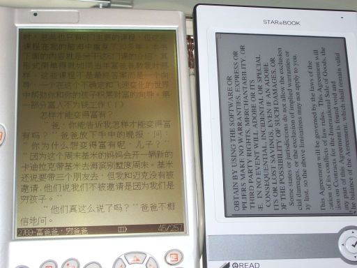 I think it is no difference with the sony reader. Although the actual reading experience is alomost as same as reading paper, the background of the sample changes with different view angle. Last edited by segatang; 12-27-2006 at 09:26 PM. |