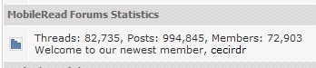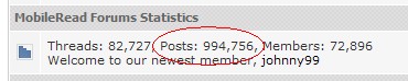 So, the burning questions are (1) Who will it be and (2) Who will take a "snapshot" of it in the MobleRead Forums Statistics section at the bottom of the Forums page...