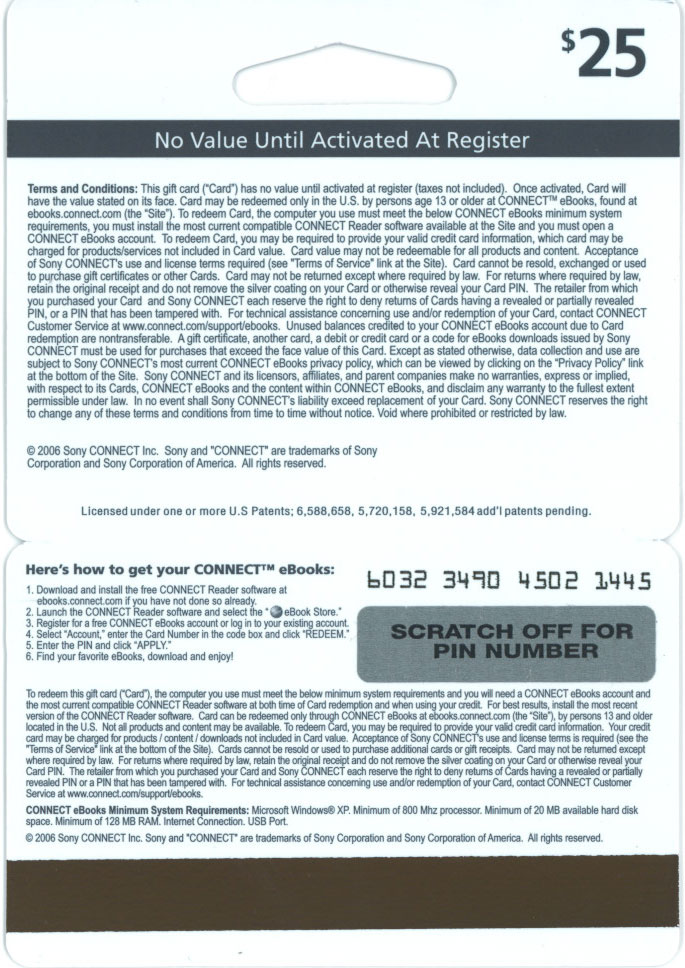 Ah, the rumor mill -- what a boring life we'd all lead without it. It's possible, very possible in fact (since I have two shiny plastic cards in my own hands), that retail stores like Borders or Sony Style may soon begin merchandising physical gift certificate cards for e-books from Sony Connect. You know, these are the cards that are usually displayed on racks near greeting cards and photo departments, and that have no value until they are activated at the cash register.This would be pretty awesome for everyone who doesn't want to or cannot use his credit card to buy e-books from Sony online. |