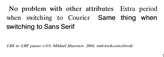It works! I tried lrf files with embeded fonts taken from yahoo group and did see different fonts in Librie for Windows, but Reader did not recognize them and used default fonts instead. Now we know that embeded fonts really work for Reader also. Incredible! I'll include this to my lrs_to_lrf parser. Do you know correct lrs records to pass it to the parsers (to follow lrs standrads)? |