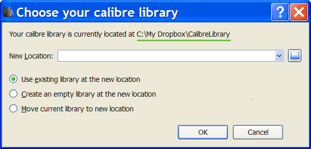 It tells you the location you are running it from across the top. Then shows three options below. The first option is to choose another existing library to view, the second option creates a new empty library and the third option moves your existing library to a new location. |
