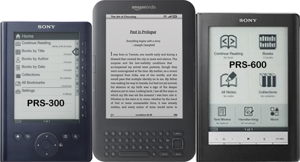 I was curious how the new Kindle WiFi would compare in size to the Sony PRS-300 and PRS-600. So I scaled images of the three readers and placed them side by side for a visual comparison.