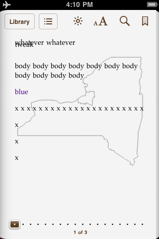<body> <div> <img alt="" src="../Images/nysmap.jpg" /> <p class="tweak">tweak</p> </div> <p>body body body body body body body body body body body</p> with .tweak {margin-top: -100%;} in the css. The map outline image scales to the screen width on my iPod Touch with iOS 4.1 in iBooks and the "body body ..." text overlays on top.... |