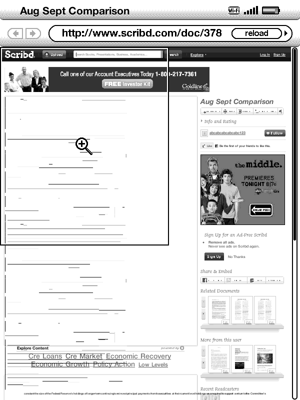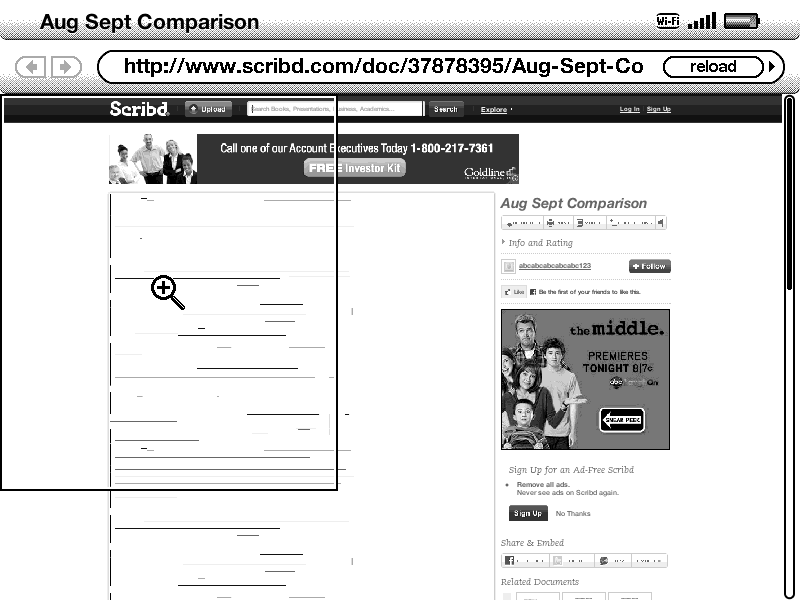 how does Scribd.com appear when using the web browser? I heard that Scribd.com has moved to HTML5 and thus would be readable on most web browsers, can someone try out this document on their Kindle 3? http://www.scribd.com/doc/37878395/Aug-Sept-Comparison or any other document Thanks |
