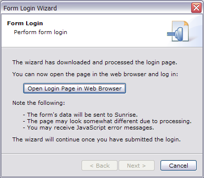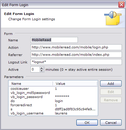 That should do it! I realize that Form Logins might be a little complicated, at least initially, but I don't think I can make them any easier to use.The Form Login Wizard may not work with every form, the processing that goes on behind the scenes might break some JavaScript logic. If you know how HTML forms work you can set up the parameters manually. |