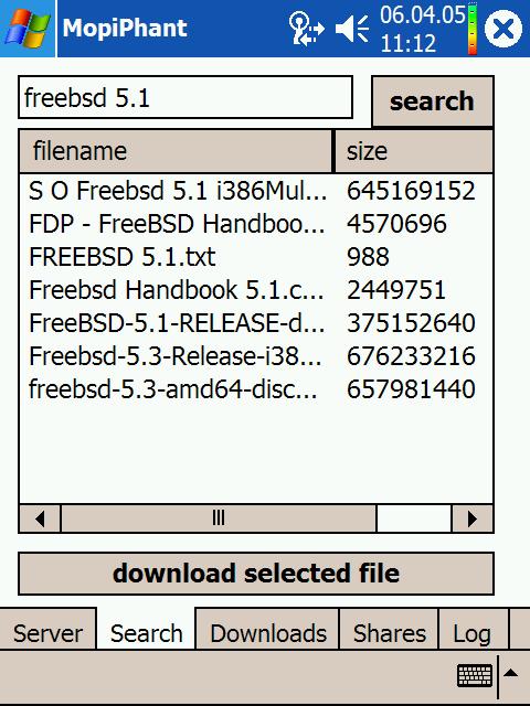 How cool is that: share your favorite pictures (and other files, legal only, of course) with your friends and others on a P2P network such as Emule. Word has reached us that this is - for the first time in history - now also possible with your WiFi-enabled Pocket PC! MopiPhant is a free compact .NET emule client for Pocket PCs released yesterday. MopiPhant (which is based on Iphant) requires MS .NET to run and you will have to copy a standard server.met database file to your installation directory before you can start MopiPhant and connect to an Emule server. One major limitation is memory. MopiPhant uses temporary files stored in directories under the installation directory. Therefore make sure to install MopiPhant in your external memory. Also make sure to have at least 10MB of program memory available (which is the size of one Emule chunk). Download links: MobiPhant ZIP (includes installable .cab files), MobiPhant Sources |